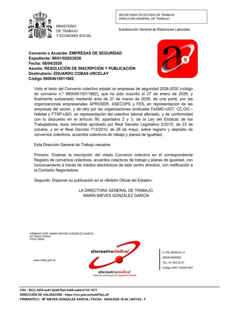 Con fecha 8 de abril de 2026 el Ministerio de trabajo ha ordenado el registro e inscripción para su posterior publicación en el BOE, del “gran convenio” al que nos han sometido nuevamente los sindicatos UGT, CCOO y USO con unas pérdidas que en los próximos años oscilará el 3% dado que el incremento del IPC ya solo este año superior a la paupérrima subida y la previsión para los próximos preve nuevas pérdidas.